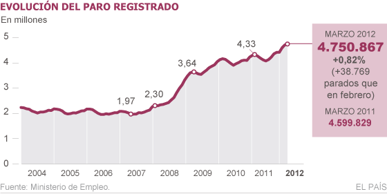 El paro registrado, que venía de sufrir en febrero su peor arranque de año desde 2009, ha subido con mayor intensidad en este 2012 de lo que lo había hecho en los dos ejercicios anteriores. Este mayor deterioro evidencia que la recaída en recesión de la economía española, agravada por los duros recortes aprobados para reducir el déficit, está haciendo mella en el tejido laboral del país. De hecho, el Gobierno cuenta con que el empleo vuelva a caer a lo largo de este añocon la pérdida de unos 600.000 puestos de trabajo a tiempo completo a lo largo de 2012.